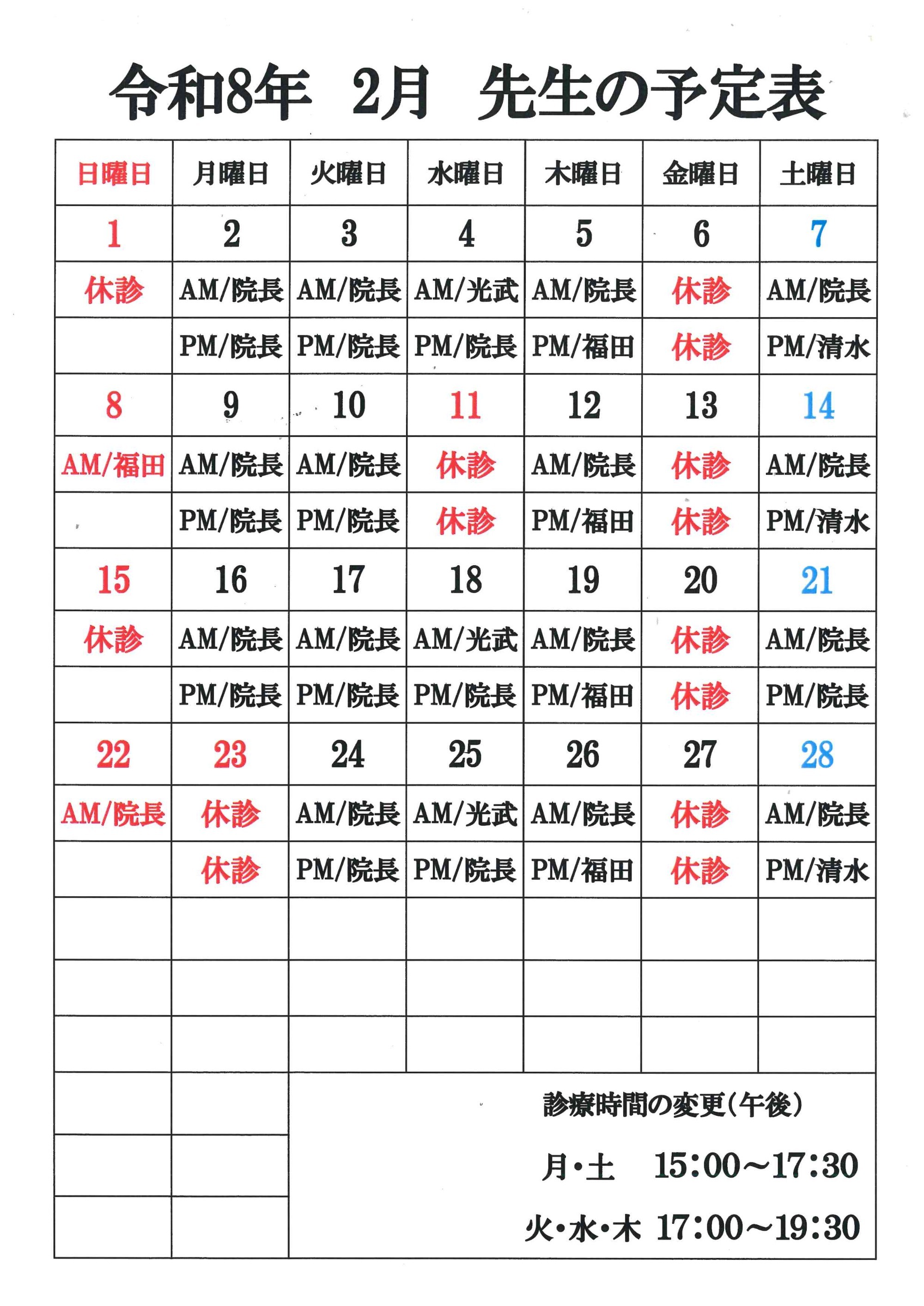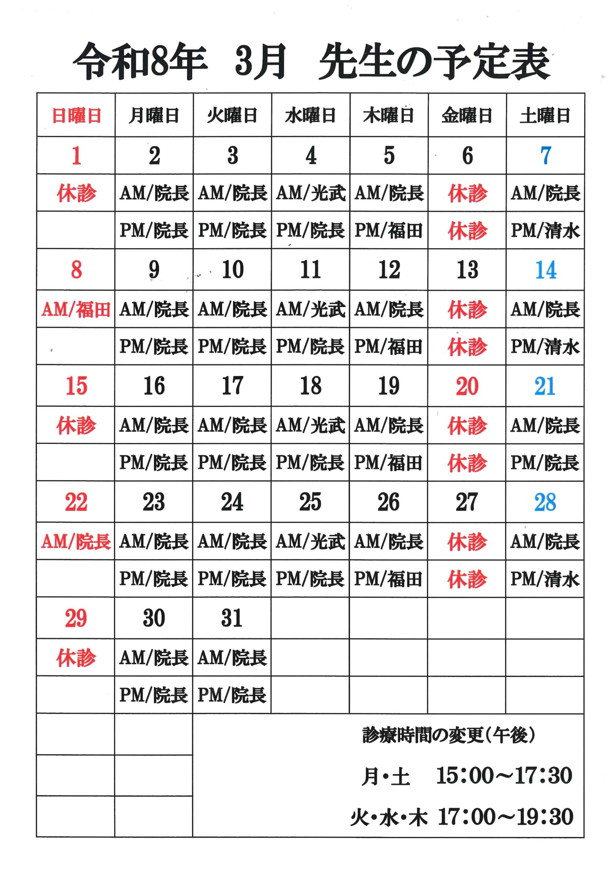| 診療時間 | 09:00 - 12:00、17:00 - 19:30 (月・土15:00~17:30) 休診日:金曜・第1、第3、第5日曜、日曜午後・祝日(日曜と重なった場合はその翌日) |